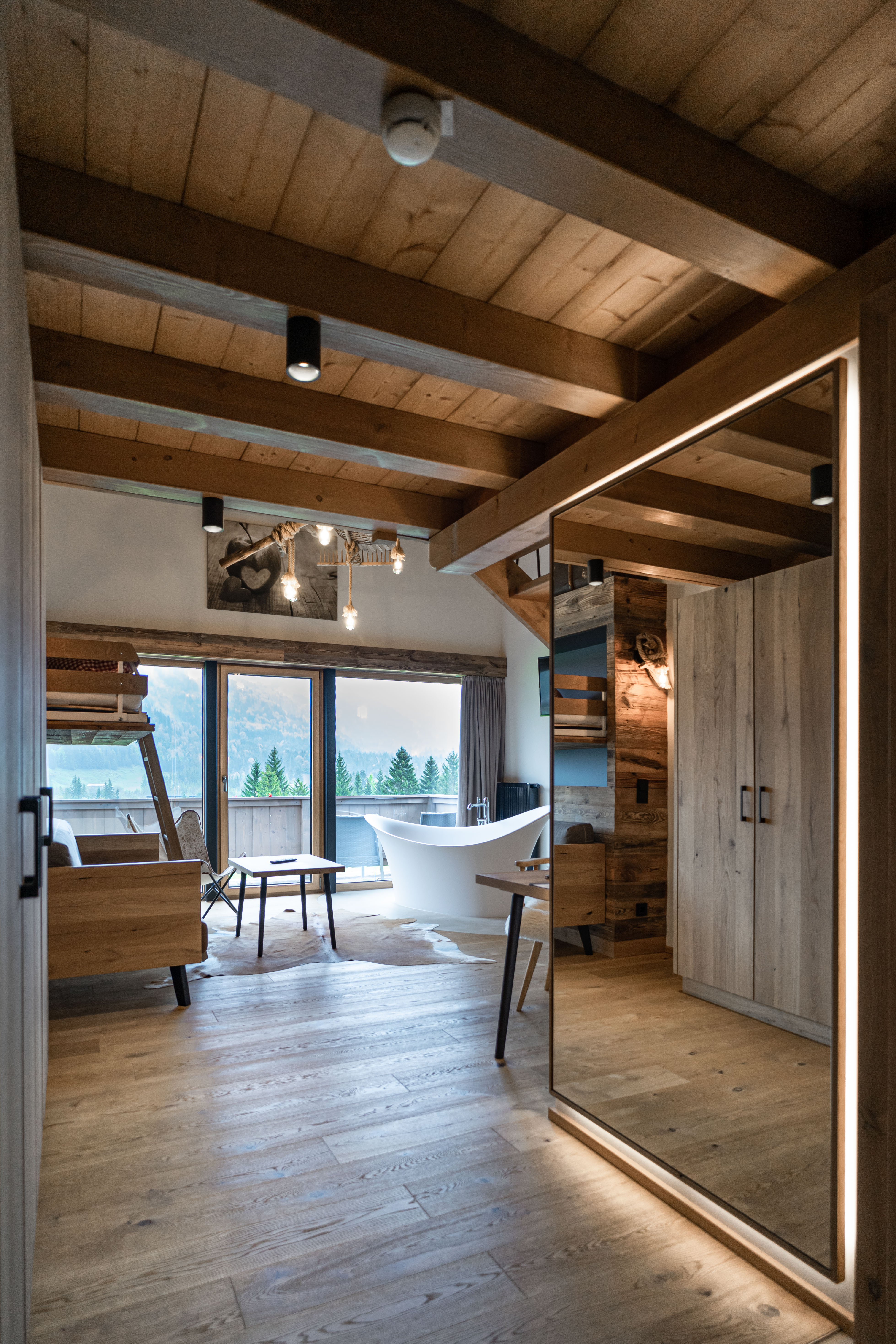 Die Suite bietet einige Besonderheiten, die Deinen Urlaub in Österreich zum Highlight werden lassen. Neben den handgefertigten Möbeln aus Eichenholz bestechen die freistehende Badewanne im Wohnbereich und der Blick auf die Steinberge.