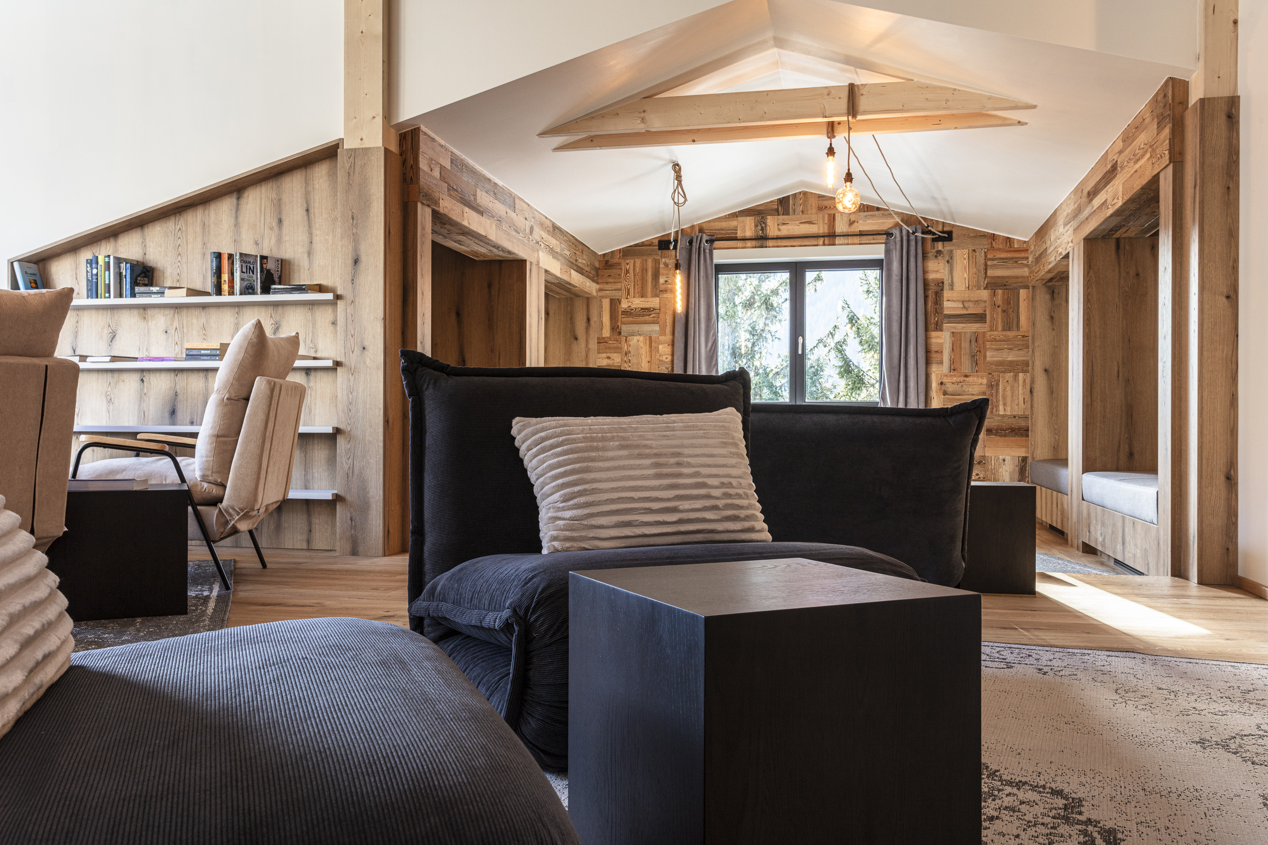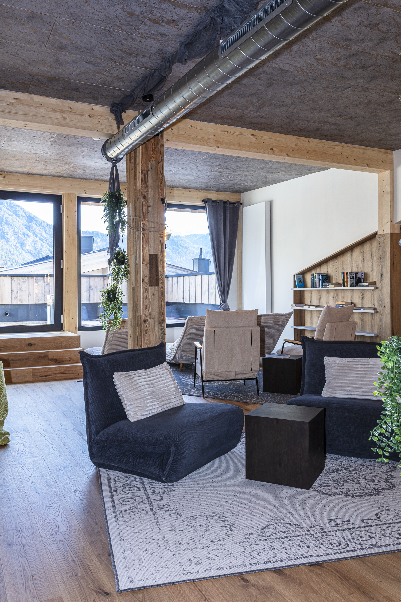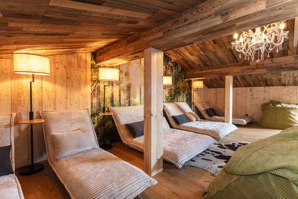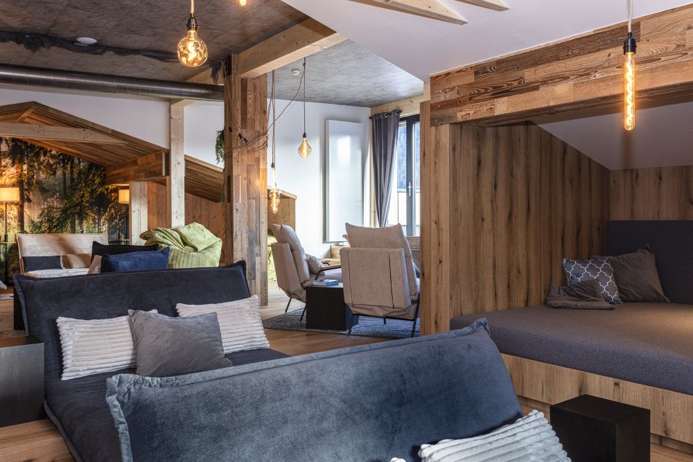 Der Ruhebereich im Dachgeschoss erstreckt sich über rund 200 m². Offen gestaltet, bewusst zoniert und mit vielen gemütlichen Ecken. Liegen, eine Leseecke, warme Materialien und liebevolle Details schaffen jene Atmosphäre, für die das Tirolerherz steht – ruhig, ehrlich und ohne Überladung. Dazu kommt der weite Blick in die Tiroler Bergwelt, der den Raum nach draußen öffnet.