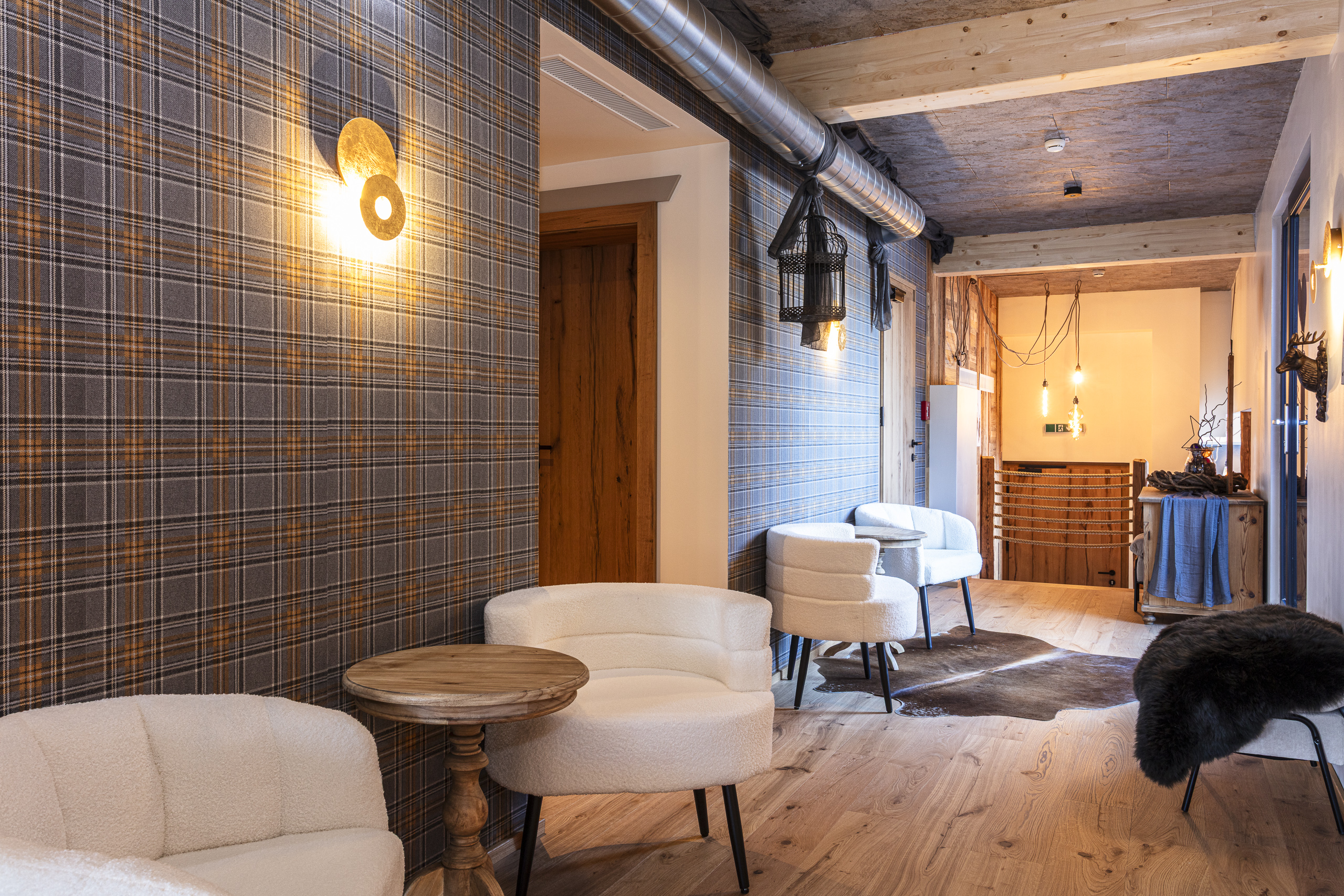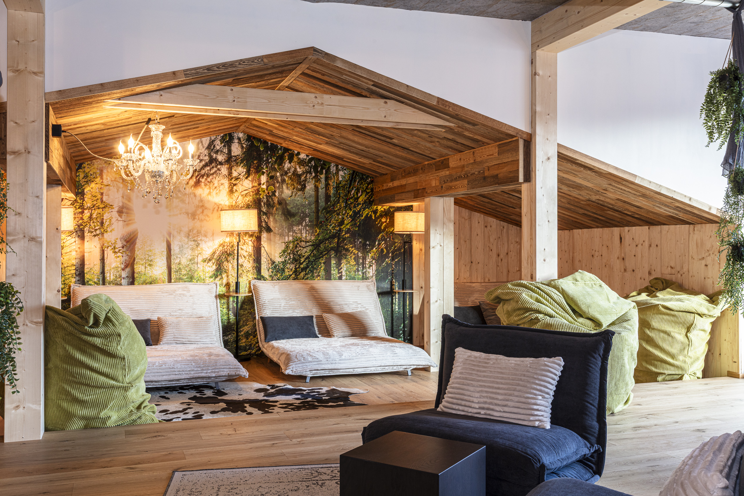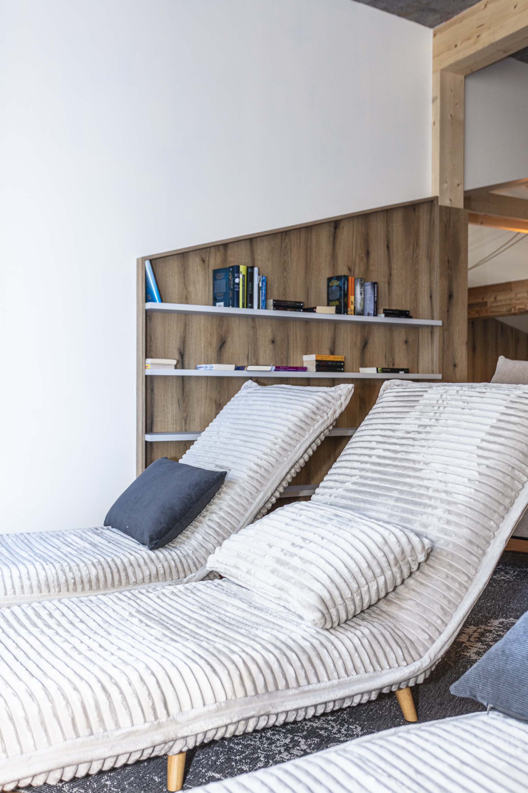 Der Ruhebereich im Dachgeschoss erstreckt sich über rund 200 m². Offen gestaltet, bewusst zoniert und mit vielen gemütlichen Ecken. Liegen, eine Leseecke, warme Materialien und liebevolle Details schaffen jene Atmosphäre, für die das Tirolerherz steht – ruhig, ehrlich und ohne Überladung. Dazu kommt der weite Blick in die Tiroler Bergwelt, der den Raum nach draußen öffnet.