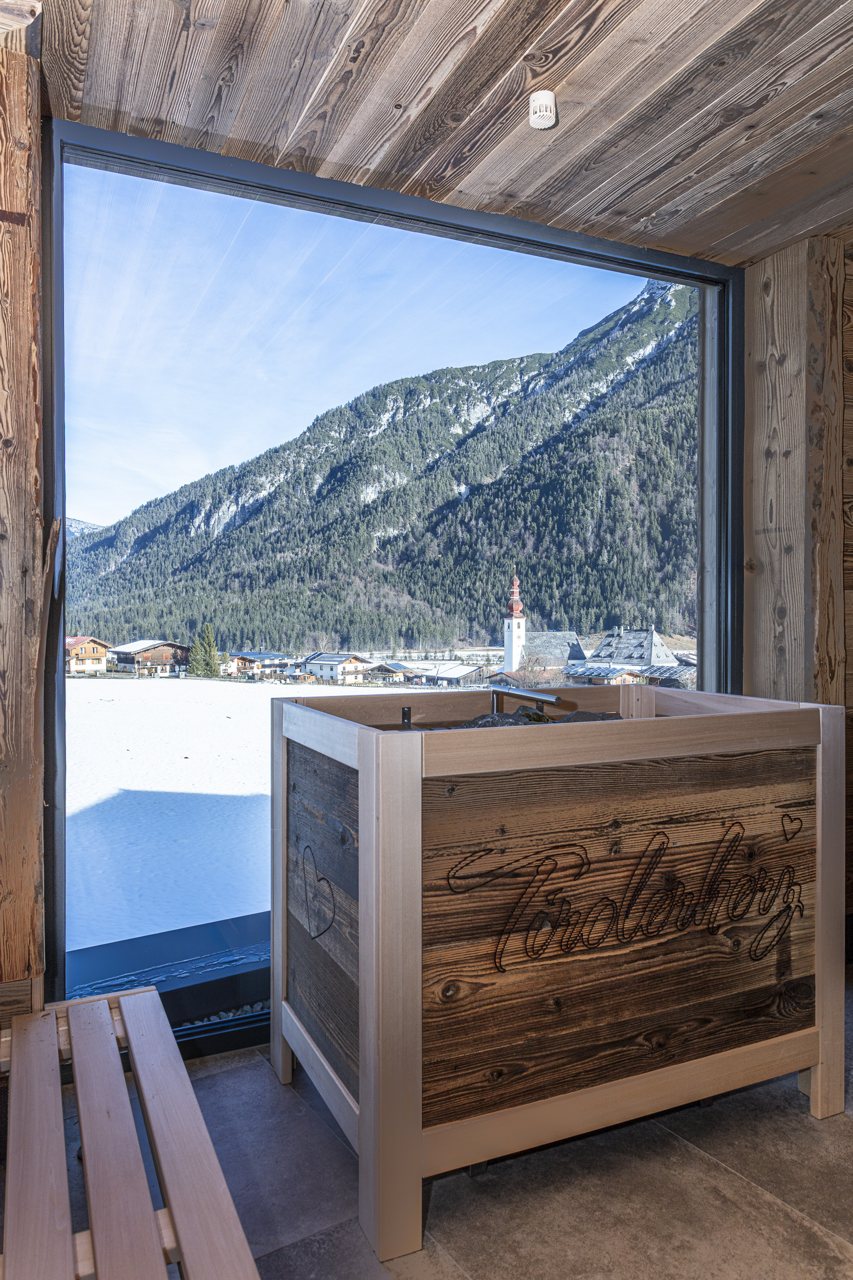 Im Wellnessbereich stehen zwei Saunen mit Ausblick zur Verfügung. Das s’Schwitzkastl, die klassische finnische Sauna, sorgt für intensive Wärme und tiefe Entspannung. Das Kräuterkistl, die Bio-Kräutersauna, wirkt sanfter und wird von natürlichen Aromen begleitet. Beide Saunen öffnen den Blick nach draußen – auf den Pillersee und die Steinberge.