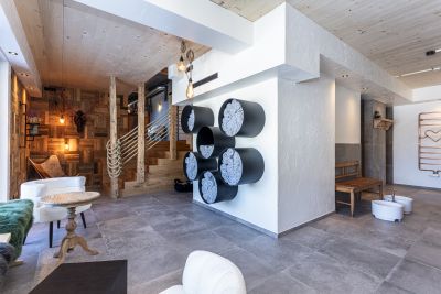 Ergänzt wird der Wellnessbereich durch eine Terrasse mit Frischluftzugang. Ein paar Schritte hinaus, klare Bergluft und Weitblick. Danach wieder zurück in die Wärme.